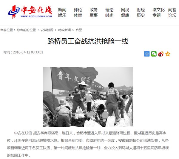 近日,公司積極響應(yīng)合肥市委、市政府號召,全力參與環(huán)湖大道和十五里河抗洪搶險(xiǎn)的事跡得到社會(huì)的高度關(guān)注。7月12日、13日,中安在線、《安徽商報(bào)》等多家省級媒體對公司抗洪搶險(xiǎn)事跡進(jìn)行了連續(xù)報(bào)道。