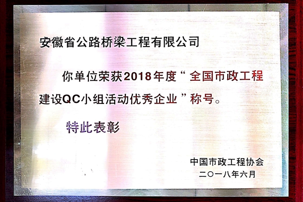 6月23日,2018年度全國市政工程建設(shè)優(yōu)秀QC小組成果發(fā)布及表彰會在昆明召開,由市政分公司組織選送的六項成果全部獲獎,公司榮獲2018年度“全國市政工程建設(shè)QC小組活動優(yōu)秀企業(yè)”榮譽稱號。