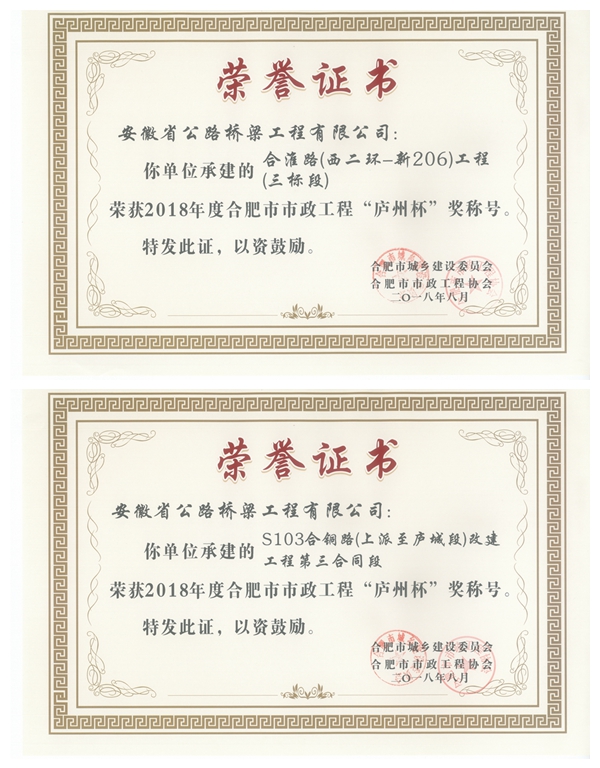 近日,從合肥市市政工程協(xié)會傳來喜訊,安徽路橋公司承建的S103合銅路(上派至廬城段)改建工程、合淮路(西二環(huán)-新206)三標兩項工程經(jīng)合肥城鄉(xiāng)建委審定,榮獲2018年度合肥市政工程“廬州杯”獎。