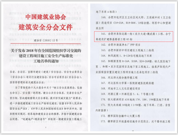 近日,從中國建筑業(yè)協(xié)會建筑安全分會傳來喜訊,公司承建的阜陽北路高架01標(biāo)和合寧高速改擴(kuò)建路基路面工程05標(biāo)兩項(xiàng)工程榮獲“2018年全國建設(shè)工程項(xiàng)目施工安全生產(chǎn)標(biāo)準(zhǔn)化工地”榮譽(yù)稱號。