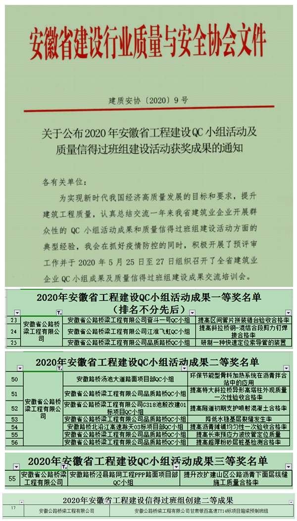 6月4日,安徽省建筑質量與安全協(xié)會公布了2020年安徽省工程建設QC小組活動及質量信得過班組建設活動獲獎成果名單。公司QC小組申報的《提高區(qū)間管片拼裝錯臺驗收合格率》等3項成果榮獲一等獎,《環(huán)保節(jié)能型骨料加熱系統(tǒng)在瀝青拌合站中的應用》等7項成果榮獲二等獎,《提升改擴建山區(qū)公路瀝青下面層縱縫施工質量合格率》榮獲三等獎。同時,甘肅銀百高速TY14標項目箱梁預制班組榮獲安徽省工程建設信得過班組創(chuàng)建二等成果。
