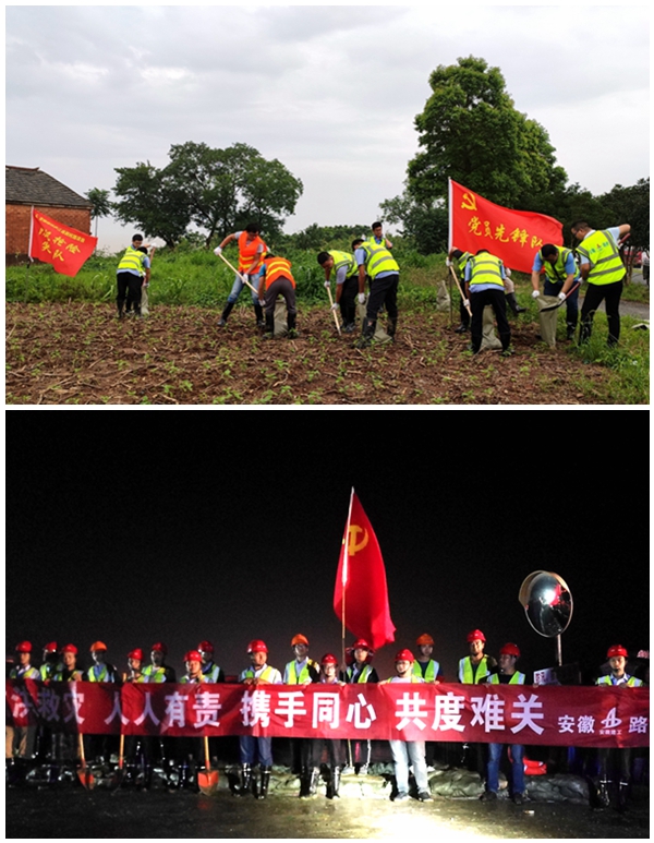 下午5點30分,接到汛情搶險指令后,安徽路橋市政分公司迅速組織多支抗洪搶險救援突擊隊轉(zhuǎn)戰(zhàn)肥西縣舒合圩參與抗洪搶險。晚上11時,在抗洪搶險現(xiàn)場,黨員突擊隊、青年突擊隊、工人突擊隊……一面面鮮紅的旗幟牢牢的樹立在一線“戰(zhàn)場”,近三百名職工在緊張有序的裝填轉(zhuǎn)運沙袋,一條高約1米長約1公里的防洪堤壩在2個小時后牢牢的擋在洪水面前。