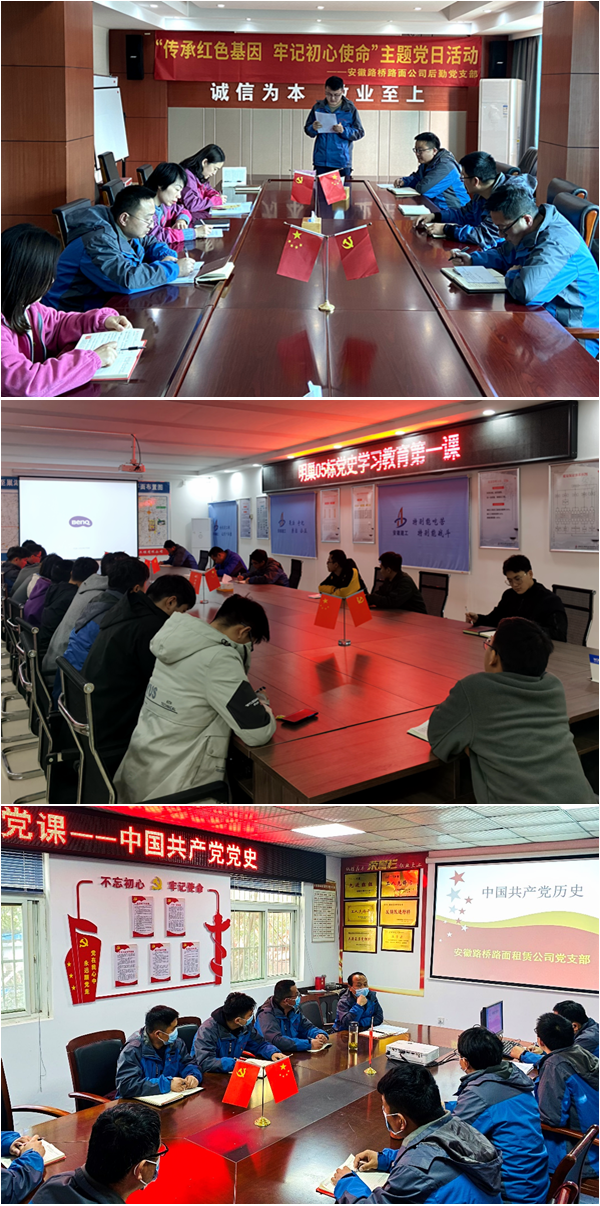 路面后勤黨支部開展“傳承紅色基因 牢記初心使命”主題黨日活動(dòng),黨員代表分享了《朱德的扁擔(dān)》《一床打補(bǔ)丁的棉被》等紅色經(jīng)典故事。明巢項(xiàng)目黨支部組織學(xué)習(xí)《中國(guó)共產(chǎn)黨簡(jiǎn)史》第一章,與會(huì)黨員以“紅船精神”為主題,結(jié)合自身工作分享如何繼承弘揚(yáng)革命精神,守好初心、擔(dān)好使命。路面租賃公司黨支部開展黨史故事學(xué)習(xí)交流會(huì),學(xué)習(xí)革命先烈在實(shí)現(xiàn)民族獨(dú)立、國(guó)家解放中所做出的突出貢獻(xiàn)和不怕犧牲、敢于流血的革命精神,并分享交流學(xué)習(xí)心得。