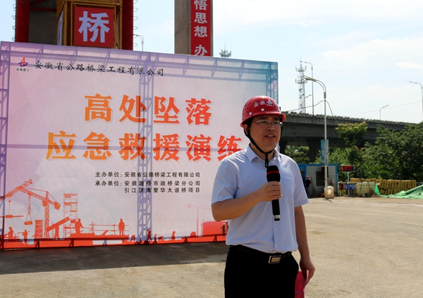 5月29日,公司在引江濟(jì)淮繁華大道項(xiàng)目舉行高處墜落事故應(yīng)急演練。公司領(lǐng)導(dǎo)班子及機(jī)關(guān)各部門(mén)負(fù)責(zé)人、分子公司領(lǐng)導(dǎo)班子成員、各項(xiàng)目經(jīng)理、繁華大道項(xiàng)目全體員工及工友代表參觀演練。