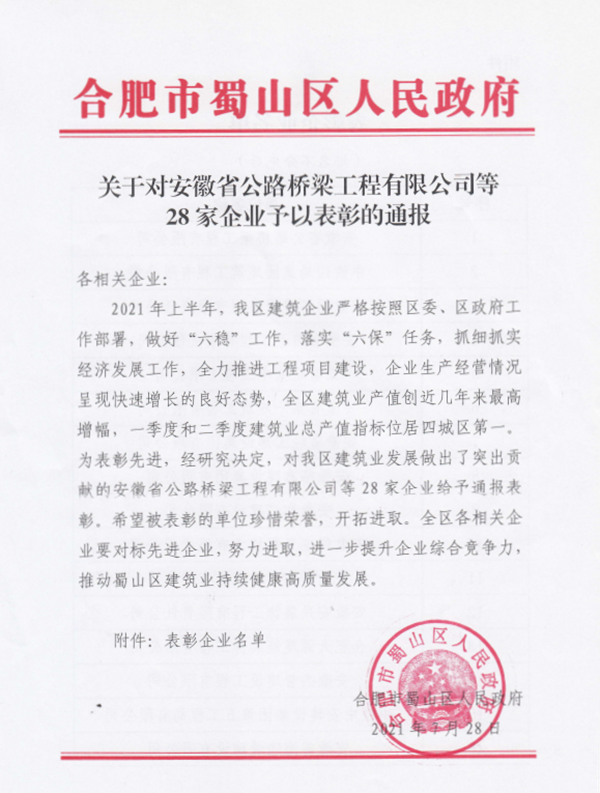 上半年,公司認真謀劃、統(tǒng)籌部署,堅持疫情防控和生產(chǎn)經(jīng)營兩手抓、兩手硬,積極做好“六穩(wěn)”工作、嚴(yán)格落實“六?!比蝿?wù),企業(yè)生產(chǎn)經(jīng)營情況始終保持增長態(tài)勢,為蜀山區(qū)建筑業(yè)總產(chǎn)值指標(biāo)上半年位居全市首位做出了突出貢獻,為此,蜀山區(qū)人民政府對公司給予通報表彰。下一步,公司將珍惜榮譽,緊緊圍繞“十四五”戰(zhàn)略規(guī)劃,進一步提高競爭力,持續(xù)推進品質(zhì)路橋卓越路橋建設(shè),為推動蜀山區(qū)建筑業(yè)高質(zhì)量發(fā)展作出新的更大貢獻。