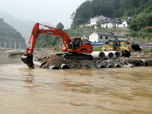 從27日開始,天氣放晴,水位下降,我部抓住機會進行第三次搶修,一臺挖機、一臺裝載機和五臺運輸車同時作業(yè),終于在28日上午打通便橋。項目部迅速組織人員把施工設備、施工材料調運到對面,28日下午恢復小型結構物施工。
