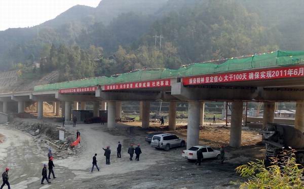 王家溝大橋設(shè)計為8孔20米,橋梁全長170.08米,共8跨28根立柱,144塊梁板,上部構(gòu)造為20米跨徑預(yù)應(yīng)力空心板,下部構(gòu)造橋墩為柱式敦、樁基礎(chǔ),橋臺為u型臺擴基、柱式臺樁基。從2009年12月份開始樁基挖空施工,克服了挖孔巖石堅硬、反復(fù)滲水的地質(zhì)困難,經(jīng)受住7月15日特大洪水和8月6日龍卷風(fēng)考驗,順利于6月份完成立柱施工,8月開始進行橋臺施工,9月6日開始梁板架設(shè)。在梁板架設(shè)的同時,橋面連接施工也已經(jīng)展開,截止11月8日,橋面連接施工只剩下最后一跨。