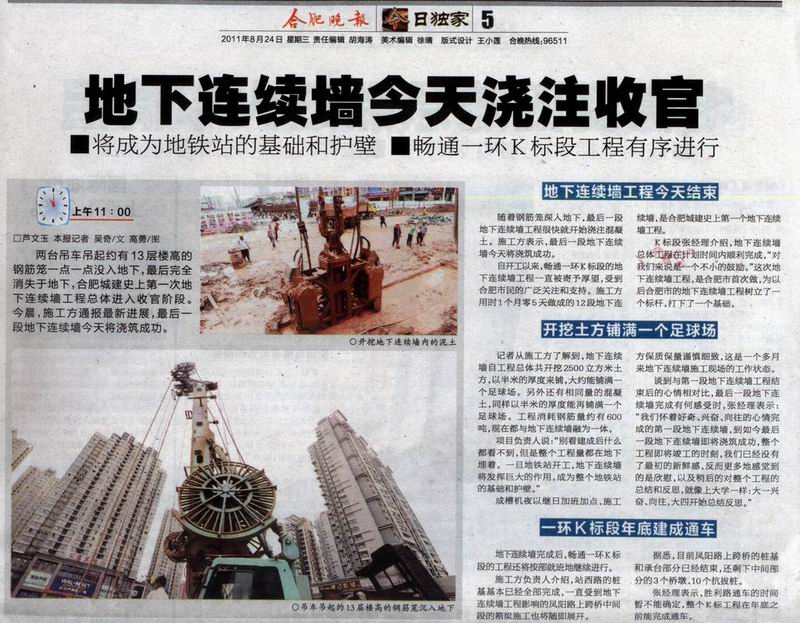 合肥晚報(bào)重點(diǎn)報(bào)道一環(huán)K標(biāo)地下連續(xù)墻施工 發(fā)布時(shí)間:2011年08月29日 來源: 發(fā)布人: 作者: 瀏覽:3243次