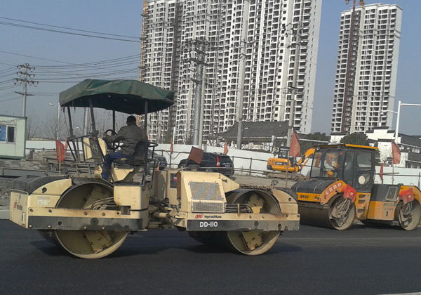 隨著第一輛運料車進(jìn)入施工現(xiàn)場,攤鋪機(jī)開始啟動,倒料、攤鋪、碾壓一條龍作業(yè),路面很快成形。為加快工程進(jìn)度,現(xiàn)場采用兩臺攤鋪機(jī)同時作業(yè)。此次瀝青砼攤鋪長度為1.2公里,懷寧北路路面瀝青攤鋪分三層,當(dāng)天鋪設(shè)的是下面層粗礫石。